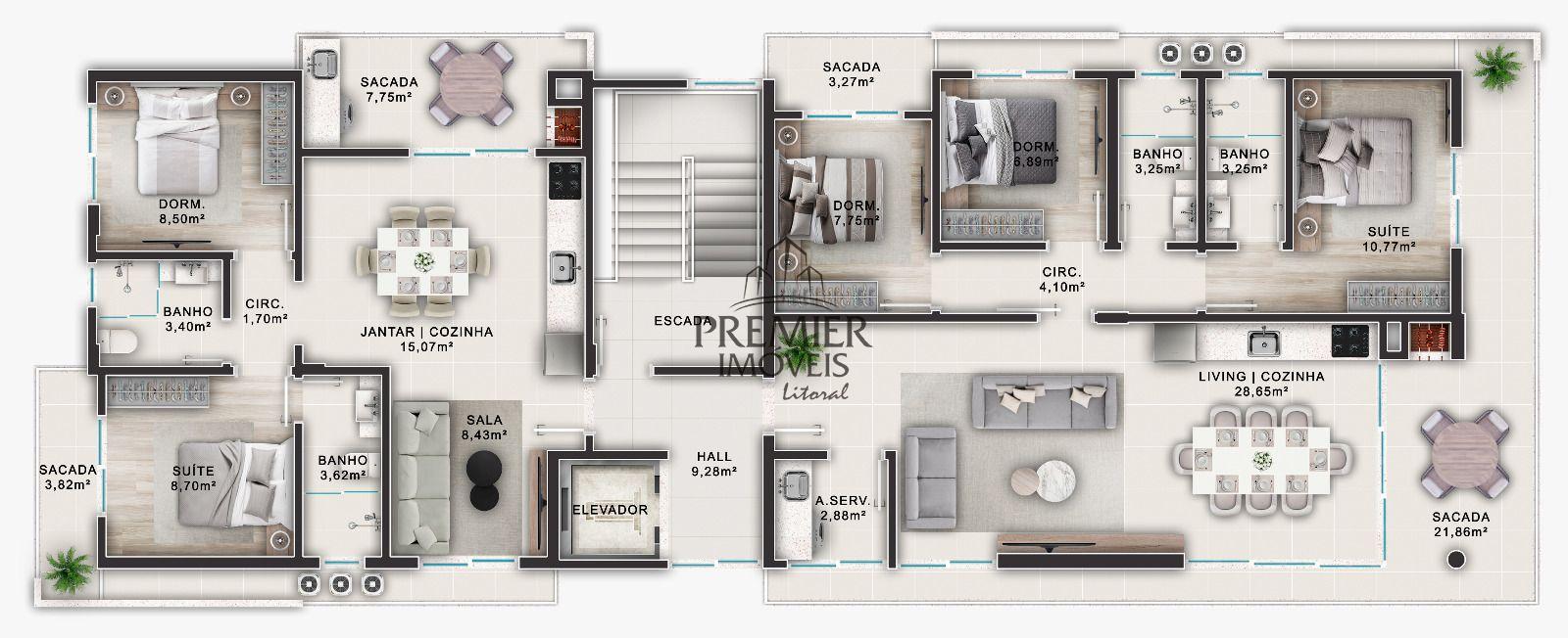 * Cobertura 09 Duplex, contendo 224,04 m² de área privativa, distribuídas em:
